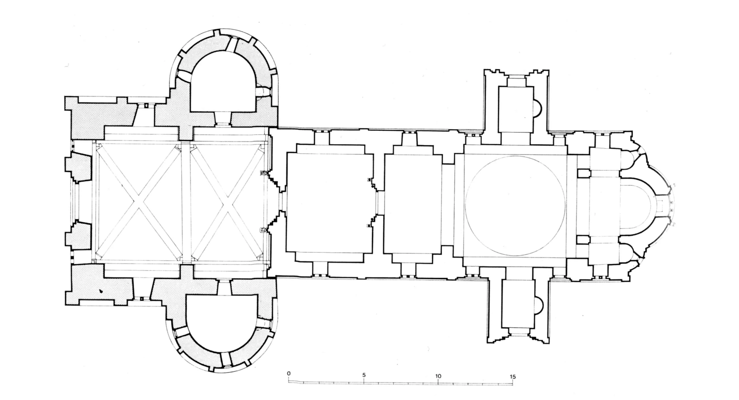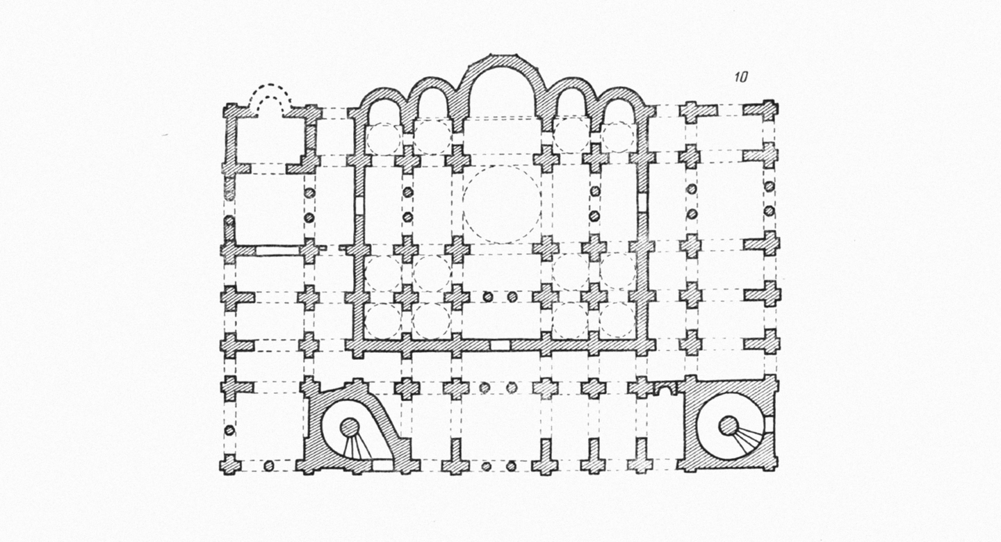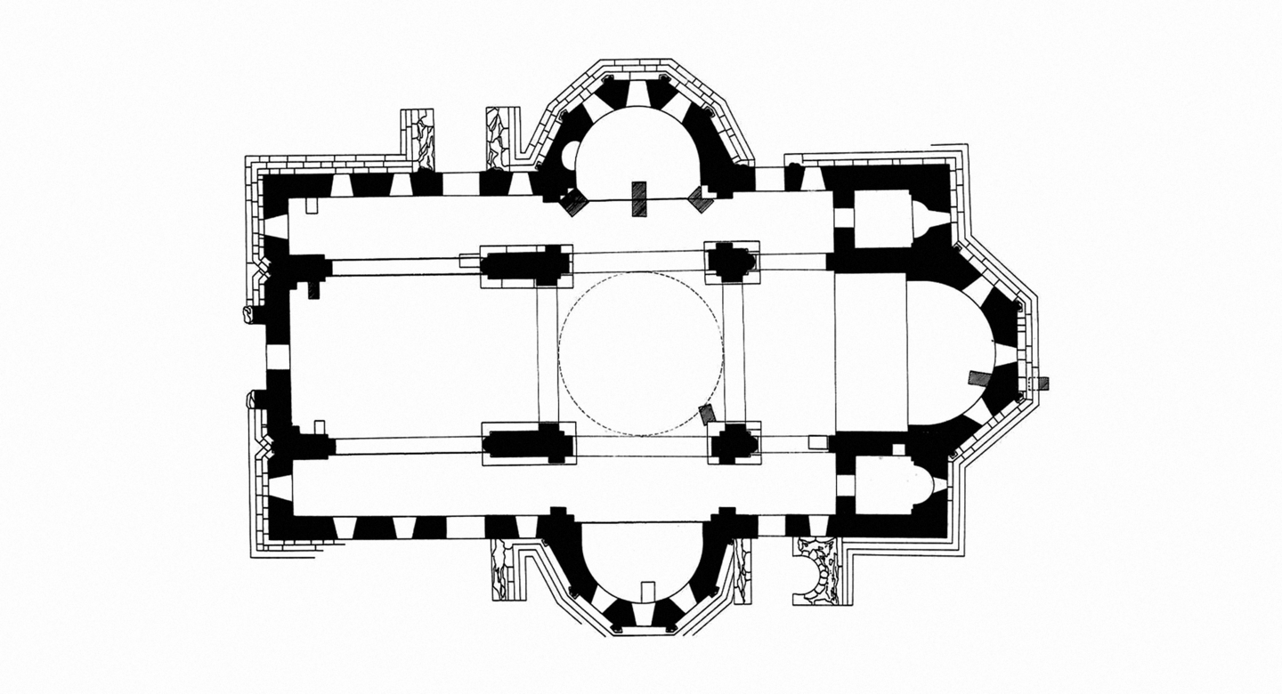 К слову то, что триконх здесь вытянут к западу (см. план), это будто бы совсем не умоляет пирамидальность и центричность этой структуры)