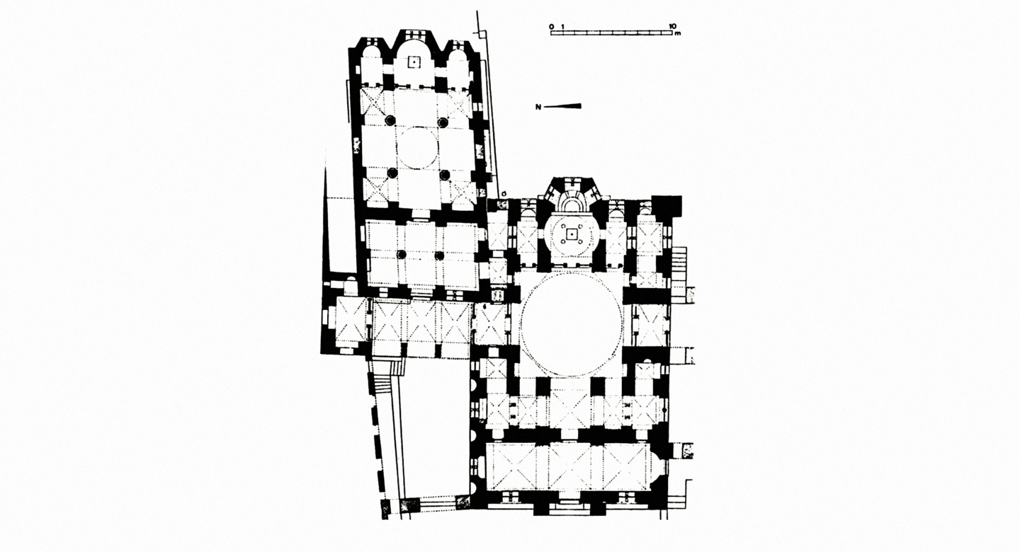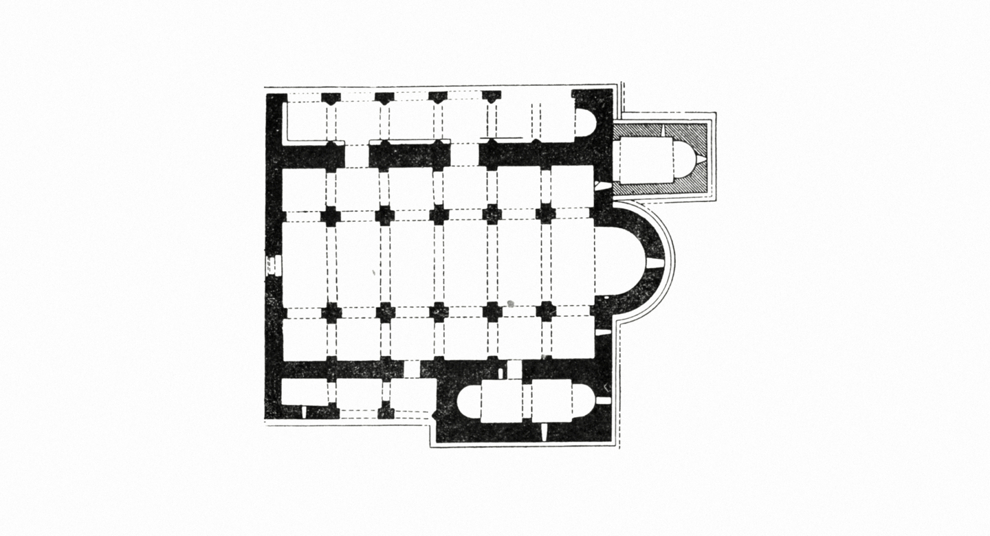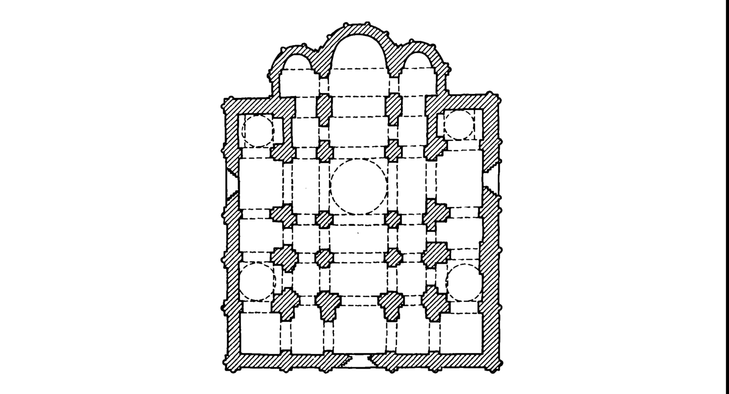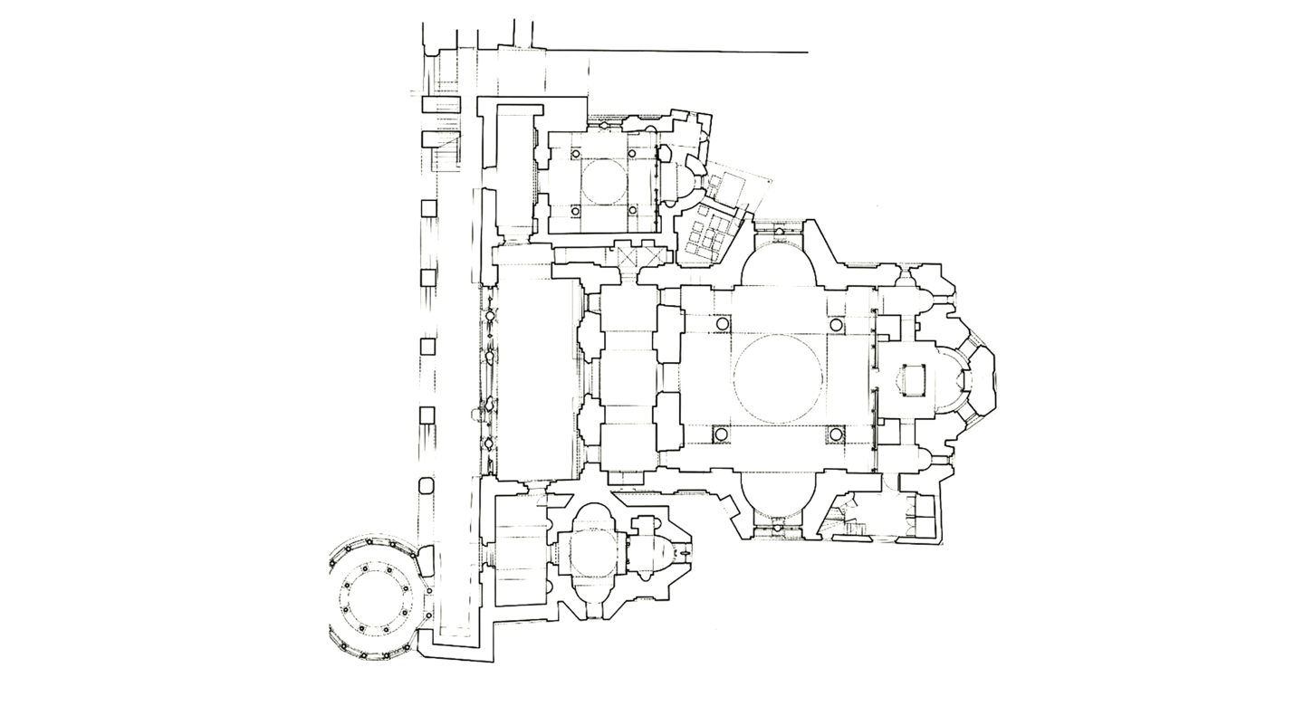 К слову то, что триконх здесь вытянут к западу (см. план), это будто бы совсем не умоляет пирамидальность и центричность этой структуры)