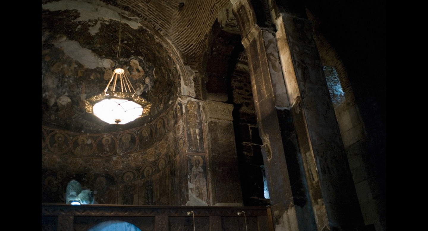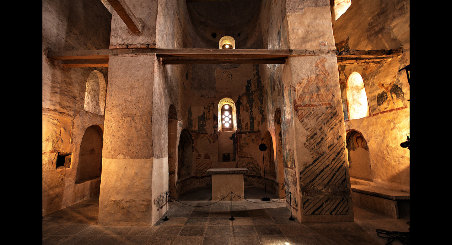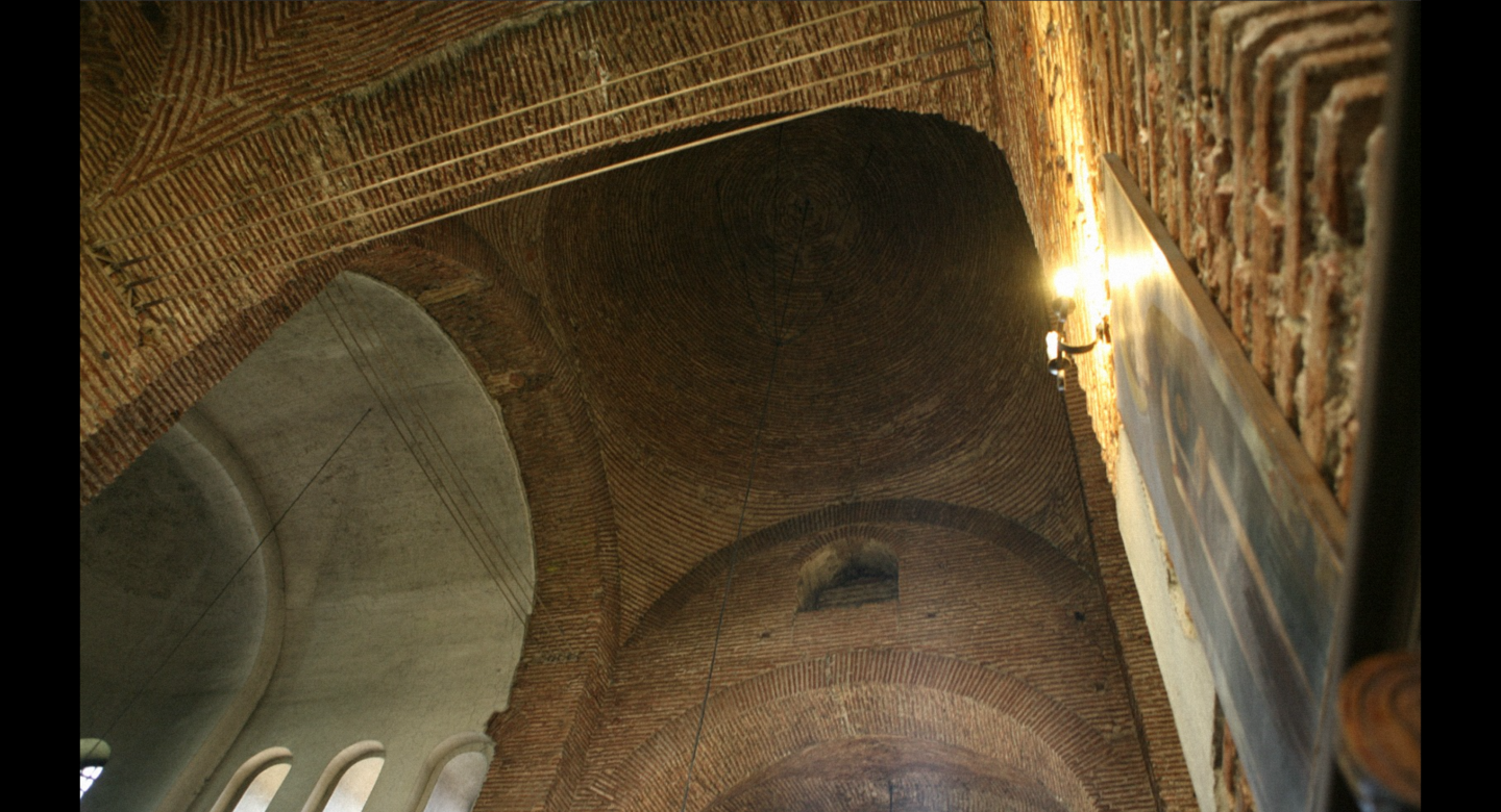 Тут сразу же можно провести параллель с армянским Ереруйком — тоже присутствуют галереи, базилика тоже на столбах (только на крестовидных, а не Т-образных), и то же характерное стремление углов вверх, заострение. Моделировка поведения задается светом — окон в храме почти нет, и они очень маленькие, так что окно в апсиде сильно выделяется (искусственный свет, сосредоточенный в алтарной части, будто бы тоже имеет место предположить)