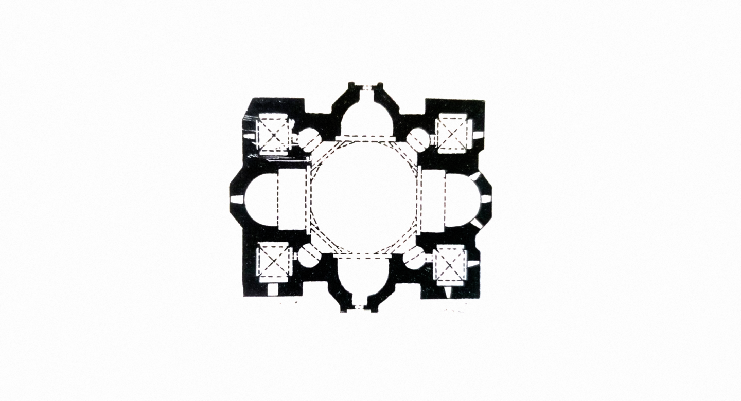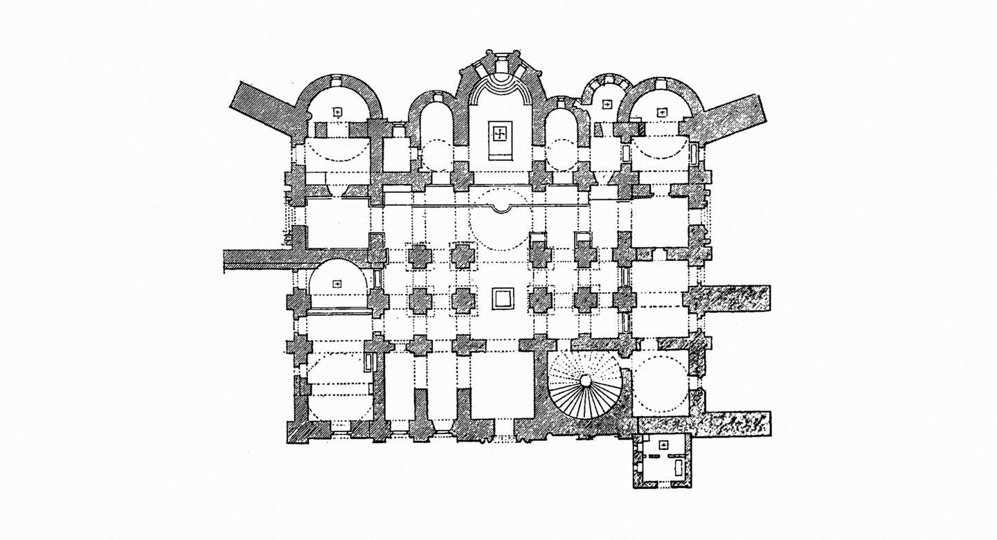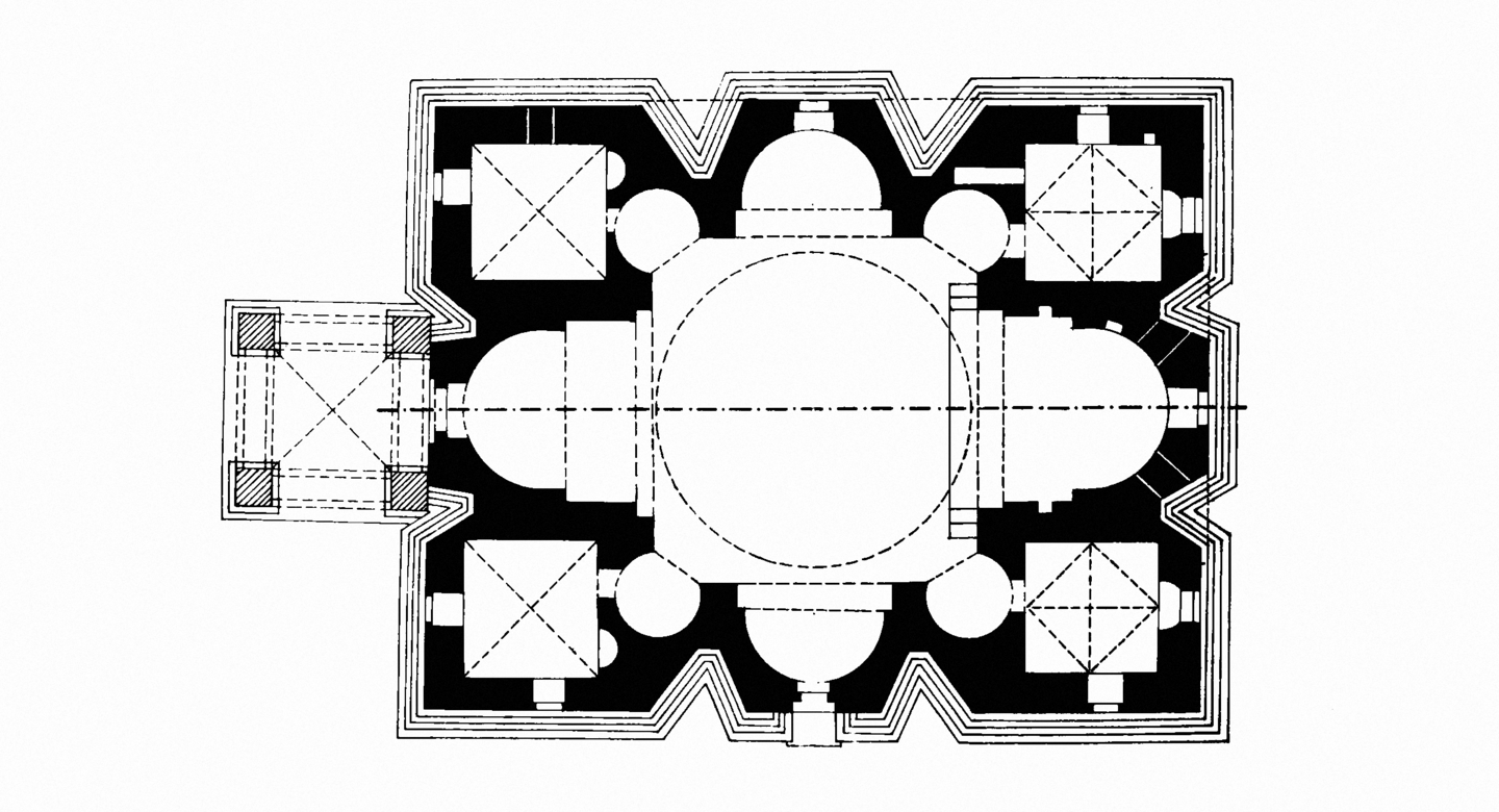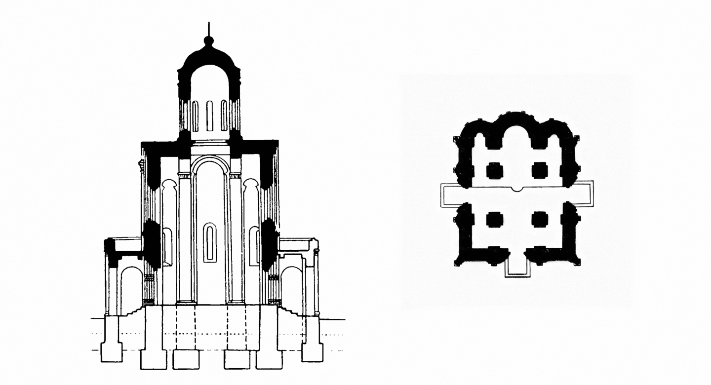 Перед нами тетраконх (от греч. τετρα-, четыре). Объемы апсид со всех сторон примерно одинаковые, и вокруг подкупольного пространства его будто «обнимают» 4 полусферы (и 4 маленькие полу-сферы), что еще больше концентрирует форму и ее движение к центру.