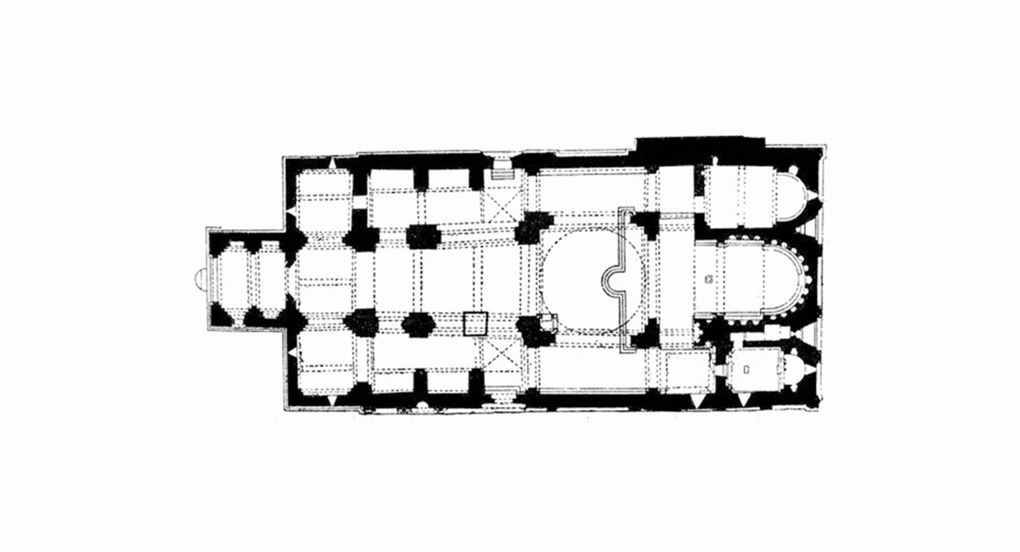 Здесь мы попадаем в длинное пространство, всячески подчиненное своему логическому завершению в конце: толкающие нас вперед точным ритмом ряды колонн, округлый объем апсиды, закольцовывающий наш взгляд и притягивающий его к себе, свет из больших аписдных окон, создающий самое светлую точку в здании.