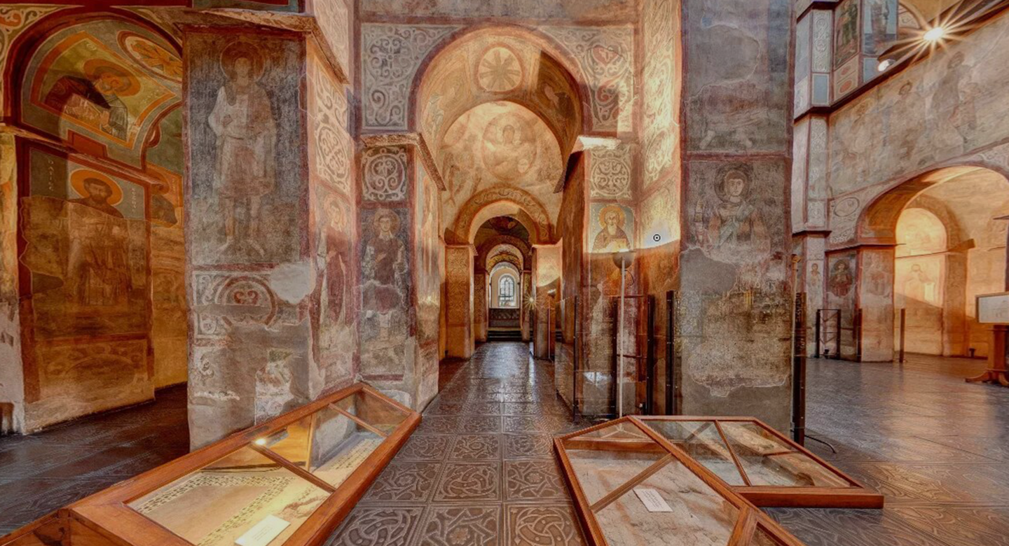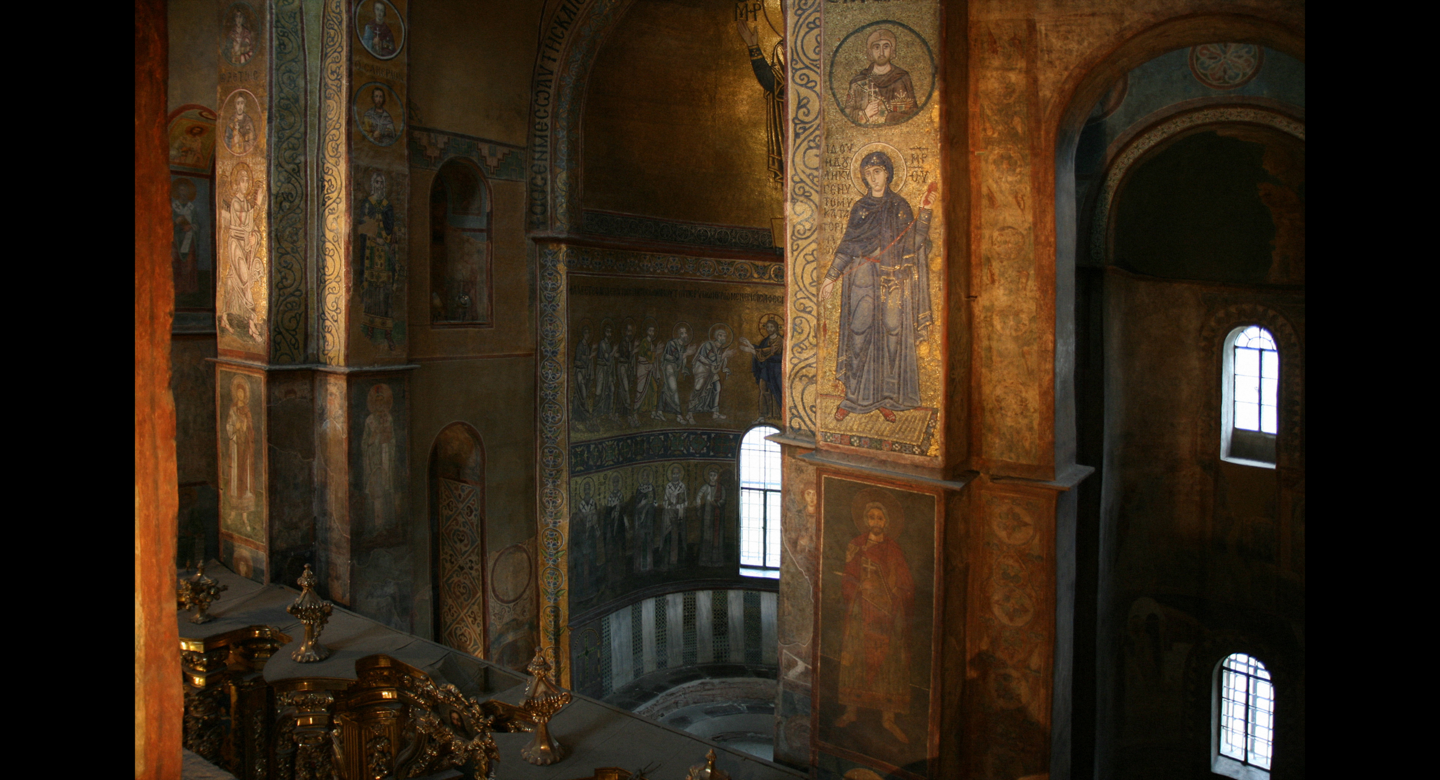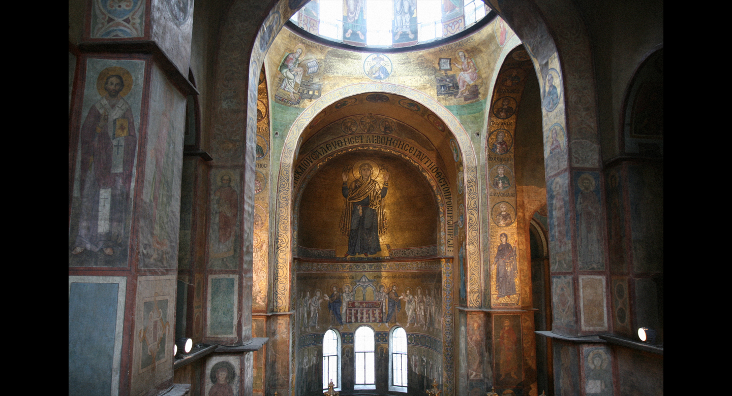 Русь вообще не начинает с «чистого» девятидольного крестово-купольного типа, а сразу с чудовищно сложного, многонефного организма. Внутри чувствуется не строгий центр, а густая сетка опор и галерей, где ядро под куполом утопает в окружении обходов и хоров, лишь сторонне двигающих тебя к середине. Купол ярко освещён и покрыт мозаикой, но путь к нему проходит через тёмные низкие пролёты и лес столпов — пространство как будто «затягивает» к центру, а не отдаёт его сразу.