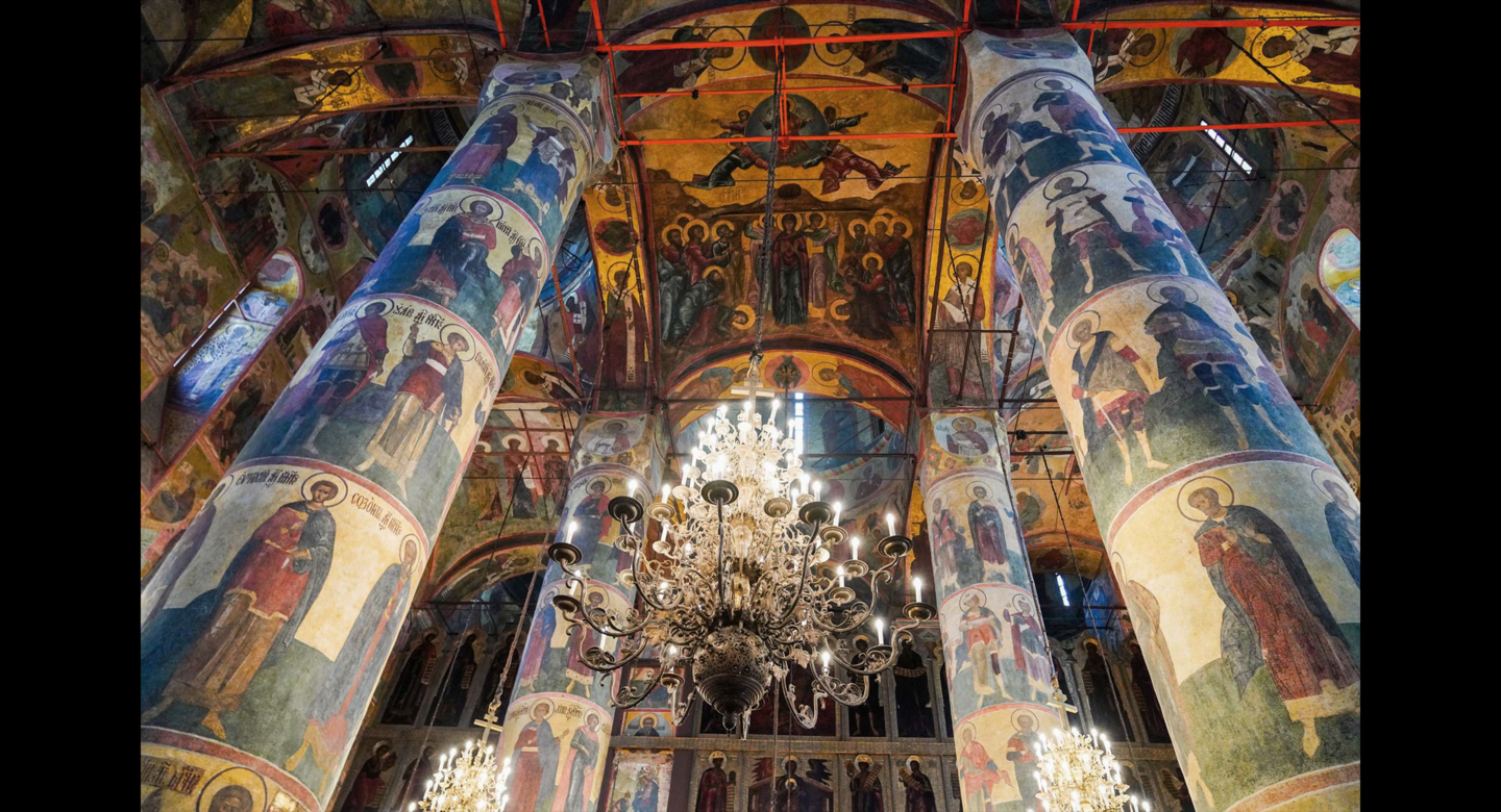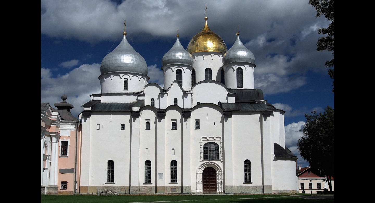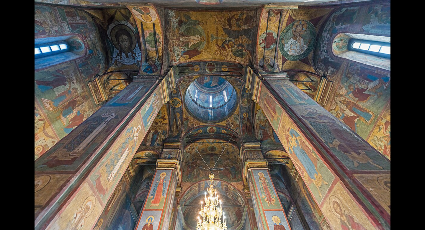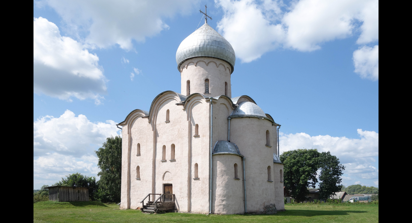 Нередица и Перынь показывают, что на севере крестово-купольный храм сжимается до максимально простого четырёхстолпного куба. Внутри центр есть, но он не взлетает вверх, как в Смоленске, а сидит низко и тяжело; боковые апсиды резко понижены относительно центральной, образуя небольшую пирамиду в зоне алтаря. Света немного, стены сплошь покрыты фресками, и купол — не ослепительный «прожектор», а скорее тусклый фон и общий узел в здании. Это очень «плотное», камерное пространство, где крест читается, но гораздо важнее целостный объём, чем акцент на центре или оси. Интенции здесь практически нет (это «практически нет» чуть слабее, чем в рассмотренных Святых Софиях — посмотрите, как к суть одному и тому же возбуждаемому эффекту можно прийти с двух разных сторон, причем все еще в рамках одной и той же типологии)