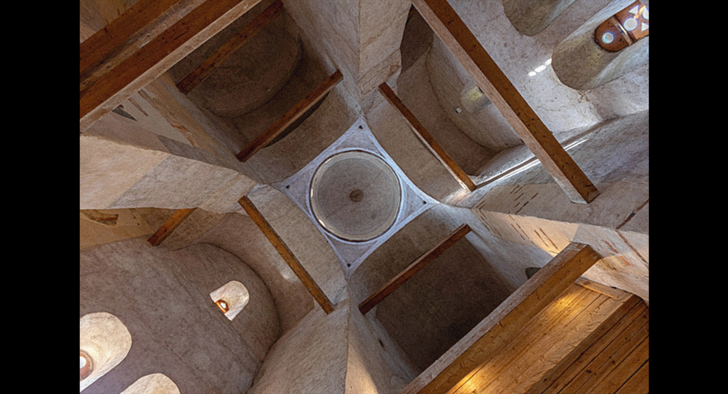Можно отметить, что тяжелая, мощная интенция здесь задается именно массой, глыбовидностью этих форм. Материал работает на то, как пространство управляет взглядом и впечатлением. Излишняя угловатость снаружи, скрытость внутренних форм (даже если аписду видно снаружи, она непременно граненая) и острые завершения всех крыш создают эту «массивную колючесть», исходящую из храмов. Внутри мы видим уже более привычные вещи (вроде купола света или сходство полусфер, задающих направление, в одной точке к куполу)