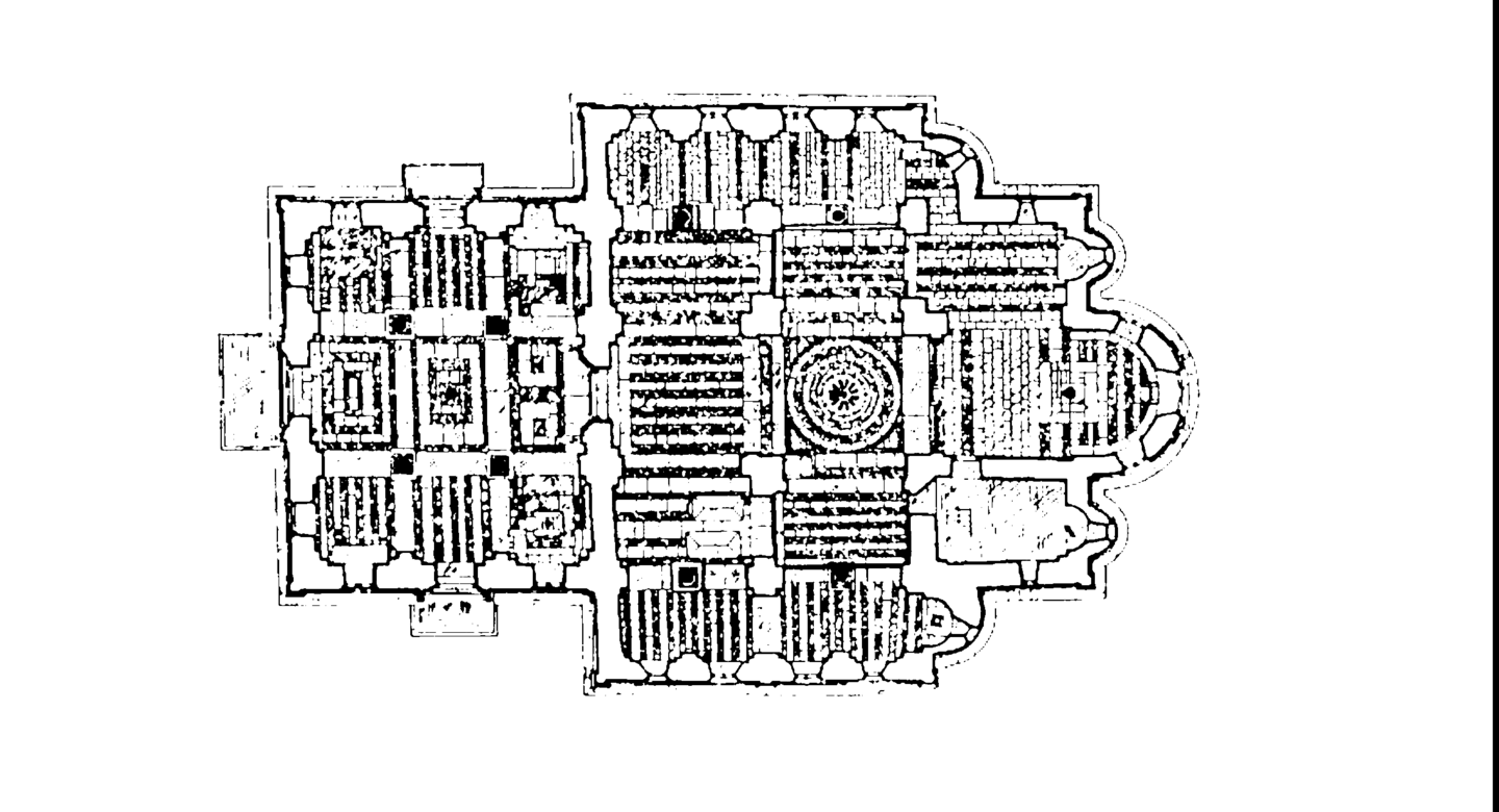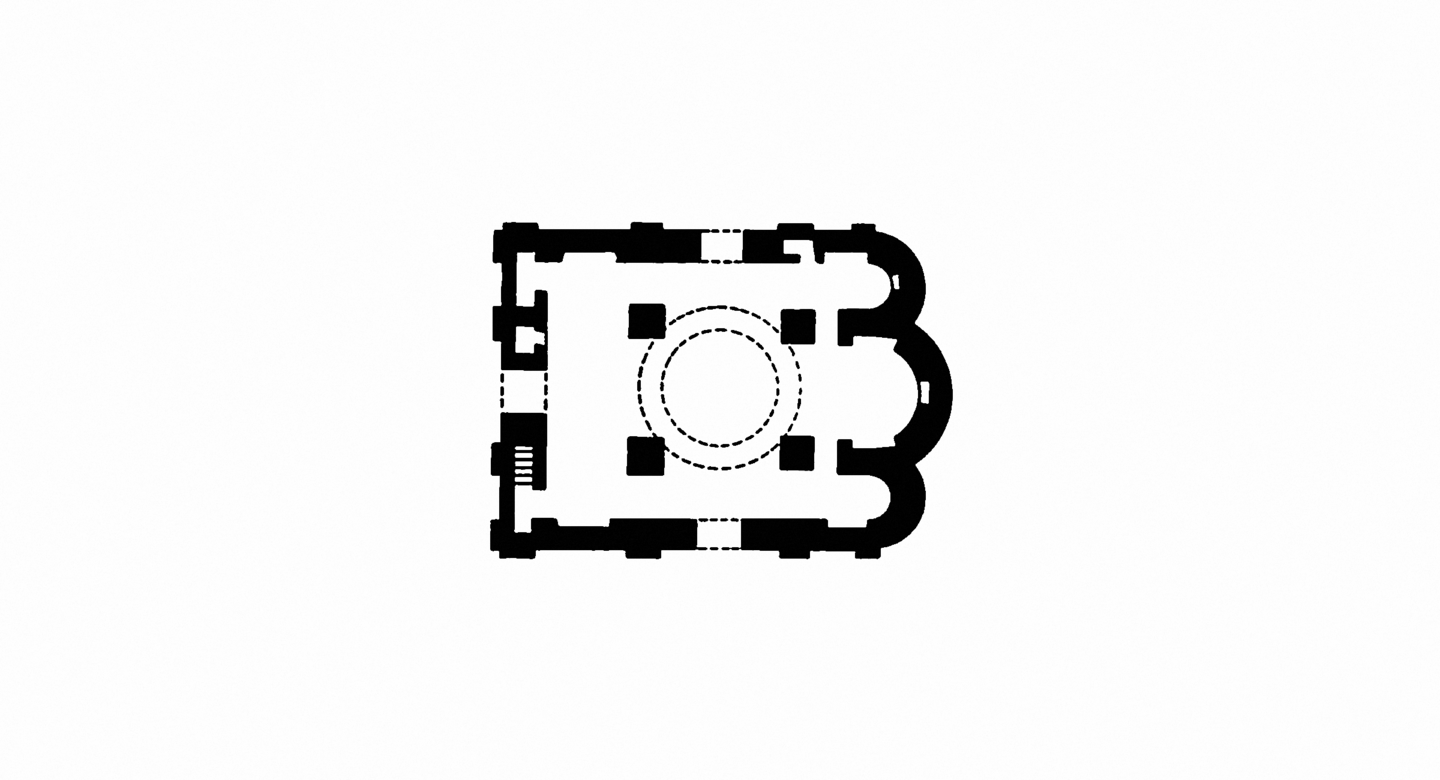 Здесь интересны следующие особенности: форма расщепляется на три направления. Общая внутренняя пластика раздробляется, поперечное движение двух других апсид разбивает процессуальное движение на восток. Кажется, теперь это работает не сколько из-за самого купола, сколько из-за столкновения направлений одинаковых по весу противопоставленных форм.