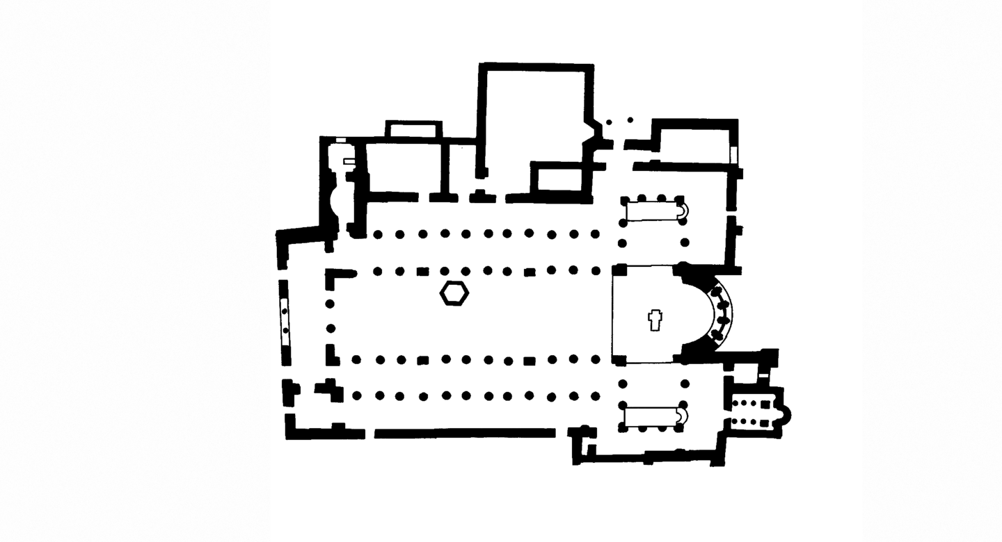 Здесь к храму 6 века пристроили несколько более поздний, и можно детально рассмотреть различия. В маленьком храме, несмотря на то, что купол уже в середине, на «базиликальное» движение он, кажется, почти не влияет — три окна на апсиде, маленькое количество света в куполе и ритмическое движение колонн вперед (см. план) все еще уводят нас на восток.
