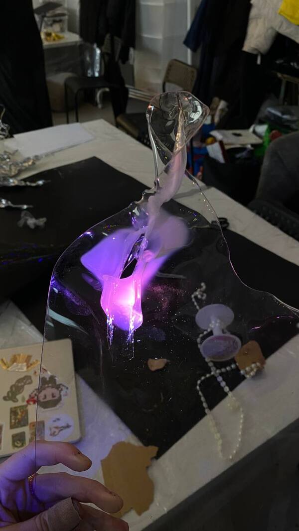 Промт: A photograph of an improvised lighting apparatus constructed from salvaged materials, featuring a circular transparent plastic attachment at its center from which bright light radiates outward. The device is adorned with strips of logographic film, shimmering glass beads, and multiple small mirrors that catch and fragment the light into dancing reflections across the scene. Transparent plastic sheets and acetate overlays are layered throughout the construction, creating prismatic effects as the central beam passes through them. Human hands are captured mid-motion, carefully dismantling or adjusting parts of this makeshift lighting equipment, with dramatic chiaroscuro lighting emphasizing the textures and reflective surfaces.