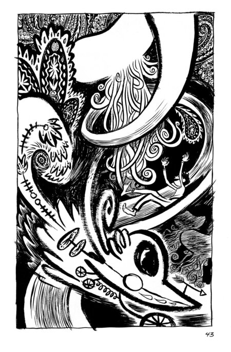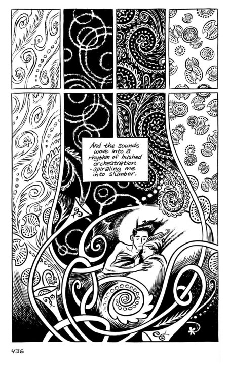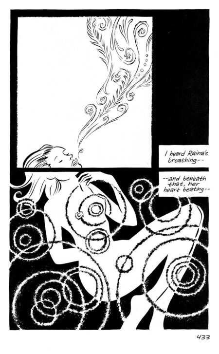 Автор невероятно умело использует графику, чтобы сделать внутреннее состояние героя зримым. От экспрессионистских, дрожащих, жёстких, угловатых линий в тревожных моментах до нежных, тонких, плавных, детальных (особенно когда изображает Рейну).
