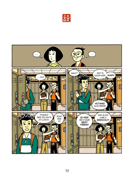 Джин Ванг. Он стыдится своего происхождения, влюбляется в белую одноклассницу и ради нее пытается полностью ассимилироваться, меняя прическу и поведение. Джин заводит дружбу с Вэй-Чэнем Суном, но и эту дружбу он воспринимает как напоминание о своей «инаковости», которую пытается скрыть. Его главный конфликт — это внутренний расизм.