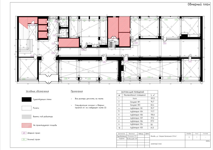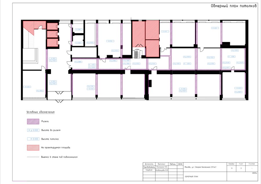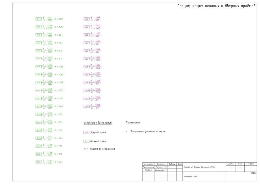 Обмерная практика. Обмерный план, спецификация дверных/оконных проёмов и план потолка в кластере Школы Дизайна на Старой Басманной 24/4с1