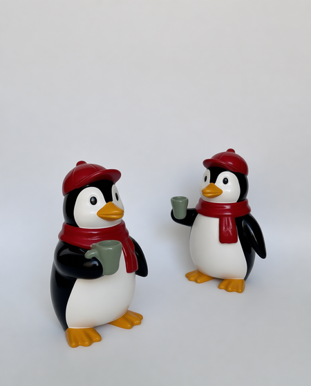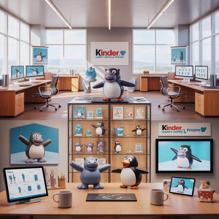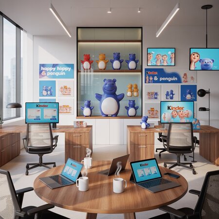 Prompt: A realistic, modern, and vibrant office interior for the sales and marketing team of «Kinder Happy Hippo & Penguin» collectible figurines. Open-plan layout with large windows flooding the space with natural light. Warm wood desks with dual monitors, ergonomic chairs, and branded mood boards showing product renders and campaign ideas. Central display area features a glass showcase filled with full-scale collectible figurines of Happy Hippo and Penguin in dynamic poses, surrounded by packaging mockups and promotional posters. A casual meeting zone has a round table with coffee mugs, tablets displaying sales dashboards, and a wall-mounted screen showing animated ads. Branding is subtle but present: Kinder logo on wall art, blue-and-white color scheme, playful yet professional vibe. Photorealistic style, architectural photography lighting, shallow depth of field, 8K resolution, clean composition.
