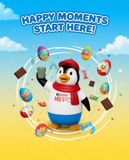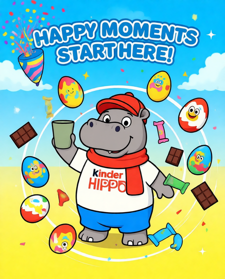 Prompt: A vibrant, joyful advertising poster for «Kinder Happy Hippo» featuring the iconic blue hippo character smiling and waving playfully. The hippo stands in the center, wearing his signature white t-shirt with red «Kinder» logo and blue shorts, surrounded by colorful Kinder Surprise eggs, chocolate bars, and smiling candy wrappers floating around. Background: bright gradient sky blue to sunny yellow, with soft clouds, sparkles, and confetti. Add dynamic motion lines and a bold headline at the top: «HAPPY MOMENTS START HERE!» in rounded, friendly, bold typography (blue with white outline). Include subtle «Kinder» branding in the bottom corner. Style: commercial children’s product advertisement, 3D cartoon realism, high saturation, ultra-clean composition, studio lighting, 8K resolution, photorealistic textures, playful and inviting mood.