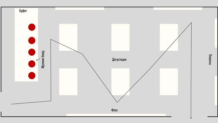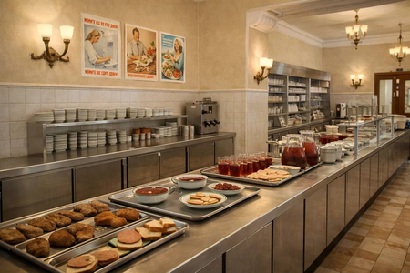 Чтобы передать эту атмосферу в зале будет представлен буфет с муляжами блюд, посуда, различные плакаты, будет играть легкая веселая музыка, которая играет через радио сотрудников буфета.