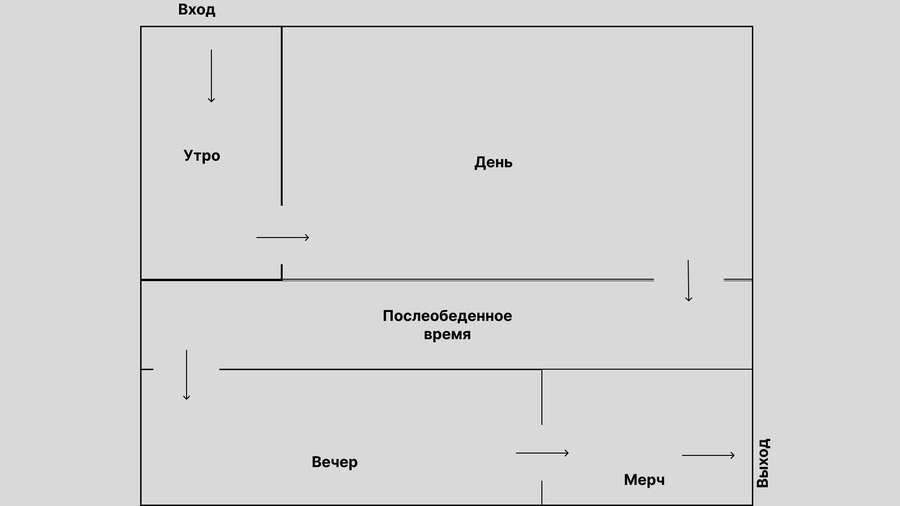 Выставка состоит из 4 залов: 1. Утро 2. День 3.Послеобеденное время 4. Вечер