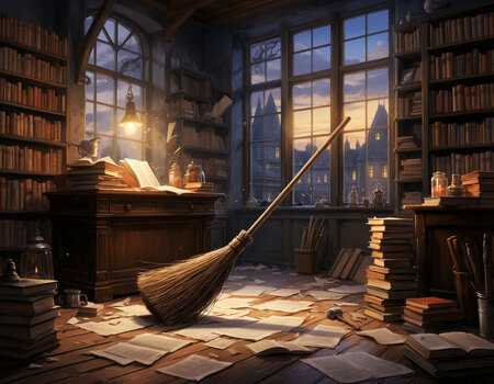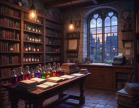 Сгенерируй изображение. Магазин оформлен в виде небольшого, уютного, магического, здания, с высокими башнями. Каменное основание дома и деревянный фасад. Возле двери перед входом табличка с силуэтом жабы. Вывеска магазина металлическая, называется «Ведьмено место». Возле магазина много товаров. Погода сумеречная, в окнах горит свет
