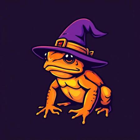 Прикрепить карточку Create a logo: an orange and yellow toad wearing a purple witch’s hat, with colours 594658 5B2A8C F29727 F26716 590303. The words «Not odd to be a toad»