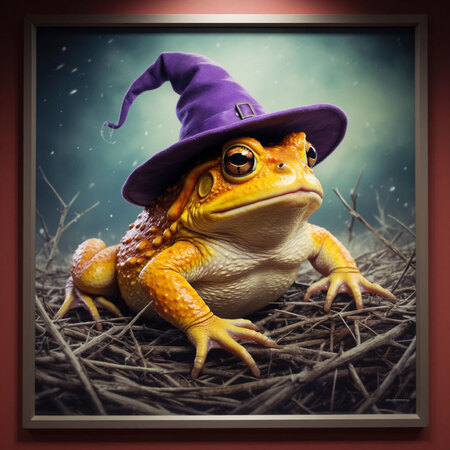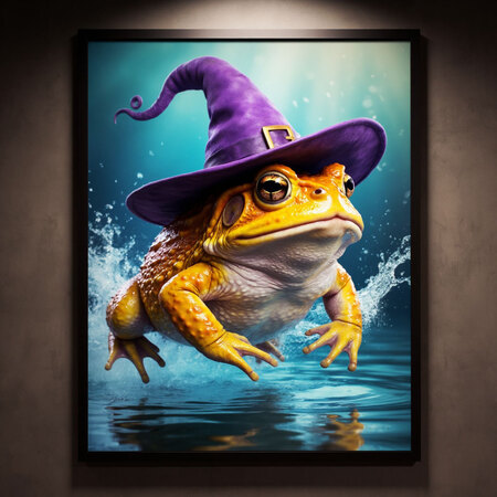Сгенерируй изображение, постер, тучная милая оранжево-желтая жаба, на голове фиолетовая ведьмовская шляпа, жаба сидит на кувшинке, кувшинки на воде 3:4 несколько вариантов