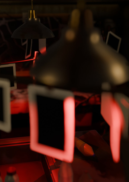 1. Сам детектив. Дрожь рук — дрожь интерфейса, что мешает увидеть, что на проявленной фотографии или прочитать текст. Помутнение в глазах — помутнение экрана, сужение FOV’а игрока. 2. Отсутствие опыта в проявке фотографий. Передержание или недодержание фотографии в растворе — проваленная задача, из-за чего цепь улик может прерваться. 3. Плохое освещение. Красный свет от мигающих ламп мешает корректному восприятию цветов на фотографии. Игрок должен подходить к единственной лампе на столе, чтобы хорошо разглядеть фотографию и не ошибиться.