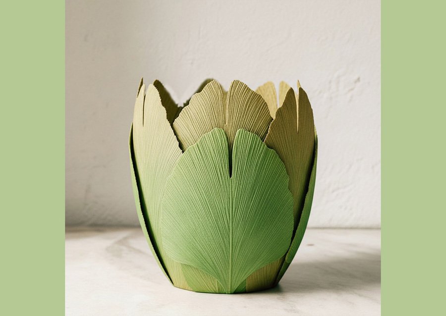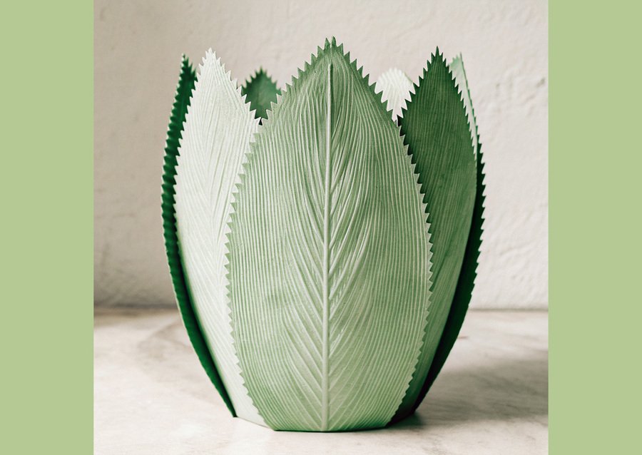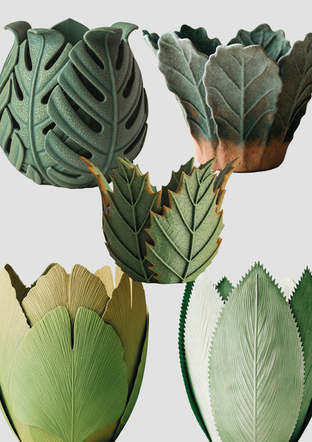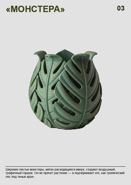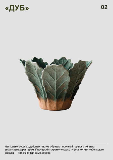 Я решила сделать серию горшков «Фолиум», вдохновившись природной геометрией листев деревьев. Каждый горшок состоит из нескольких листьев, создающих стенки горшка, повторяющих форму листа растения или дерева — клёна, дуба, монстеры, берёзы и гинкго. Горшки выполнены в пяти размерах — от миниатюрного до крупного.