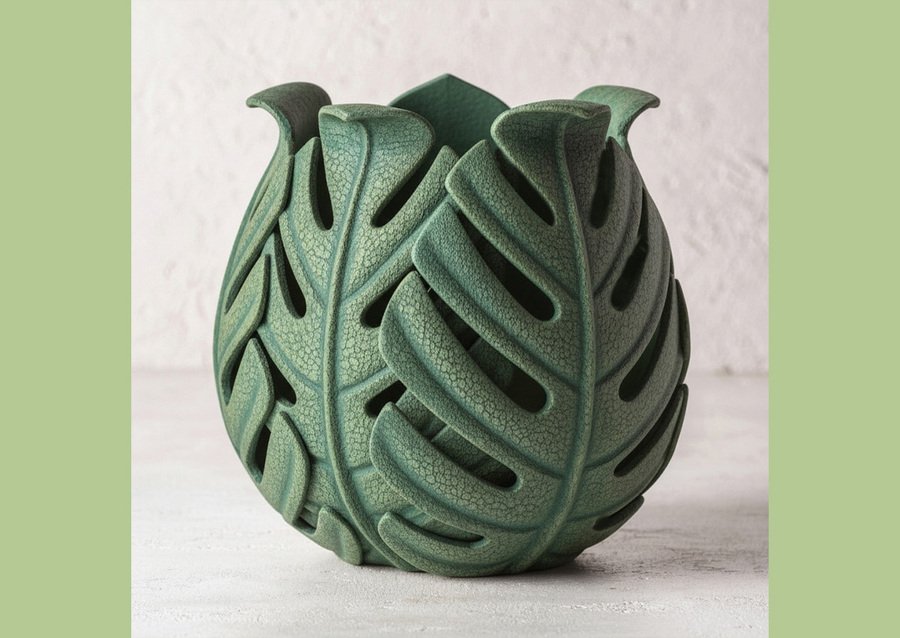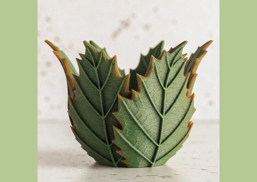 2. Материал Тип сырья: PLA (Polylactic Acid) Вариант материала: PLA+ или PLA Wood/Stone Blend — для имитации природной текстуры (древесины, камня, глины). Цвет: Клён — зелёный с оранжево-амберными краями (цветовой градиент через смену нити или постобработку). Дуб — глубокий зелёный с коричневыми тонами у основания. Монстера — мраморный эмеральд + оливковый с матовым эффектом. Берёза — светло-зелёный с серебристо-бежевыми акцентами. Гинкго — лаймово-зелёный с золотисто-жёлтыми краями. Фактура: Матовая, слегка шероховатая поверхность — имитация натурального листа