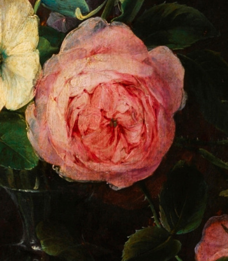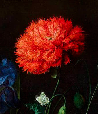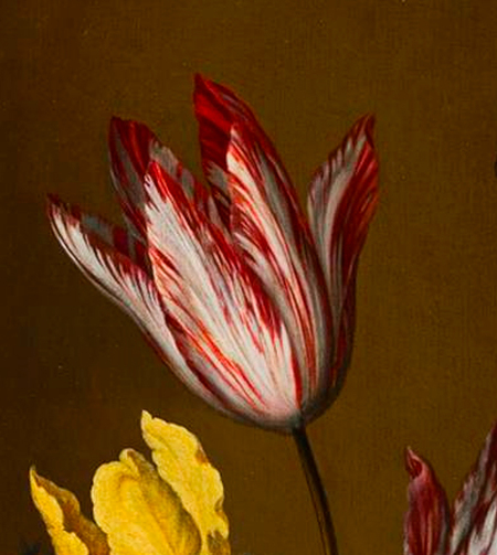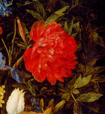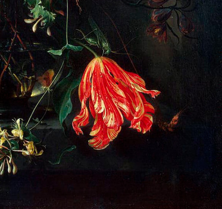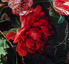 Тюльпаны по-своему хрупки и быстротечные. В то время они стоили дорого. Поэтому их присутствие в картинах стало символом роскоши и экономического бума. Пышный бутон Пиона в натюрморте олицетворяет процветание и романтику. Розовый цвет символизирует элегантность и нежность.