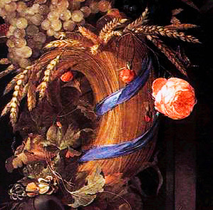 Но кроме цветущих растений, авторы изображают увядшие цветы с опадающими лепестками, засохшие стручки гороха. Увядающие растения символ бренности бытия и скоротечности времени.
