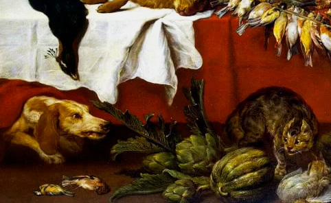 Кошка в средние века символизировала дьявола, а мышь — душу, которая постоянно подвергается сложностям и испытаниям. В Новое время кот, который вонзал свои когти или зубы в большой кусок мяса, устойчиво напоминал о физическом удовольствии и сексуальном влечении.