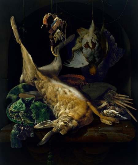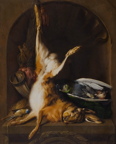 1. Натюрморт с битым зайцем, куропатками и другими птицами в нише, около 1675. Холст, масло, 10,55×8,85 см. 2. Натюрмот с зайцем. Холст, масло, 99×76 см.