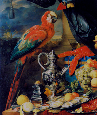 Акцентом в натюрмортах мог стать попугай ара. В Средневековья эта птица уподоблялась праведникам и символизировала красноречие и благодарность.
