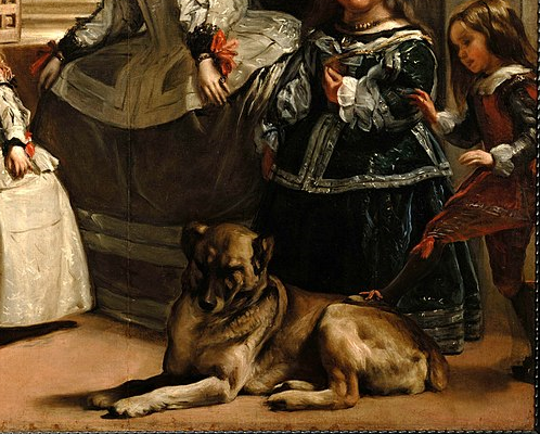 «Полотно изображает сцену написания Веласкесом совместного портрета испанского короля Филиппа IV с его супругой и племянницей Марианной Австрийской в присутствии их дочери инфанты Маргариты Терезы со свитой.» — Описание из Википедии. Собака находится на переднем плане.