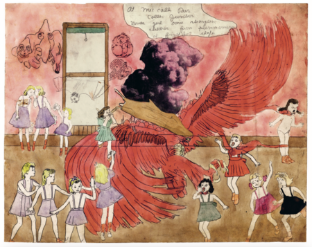 Генри Дарджер. «Снова убегающий от лесного пожара» (слева) / «На снимке Дженни Тернер, Девушки Вивиан в плену — сцена повешения» (справа). Дата неизвестна. Recent acquisitions | City of Paris Museum of Modern Art (дата обращения: 19.11.2025)