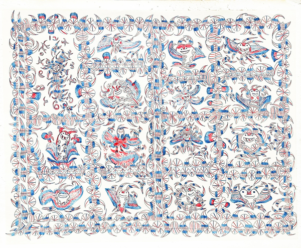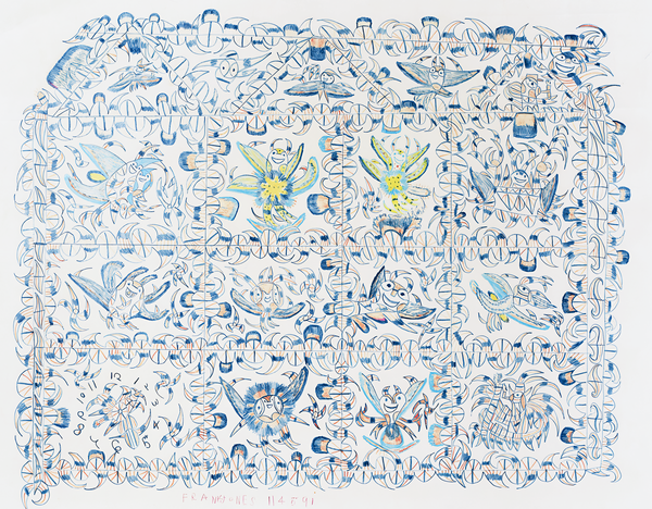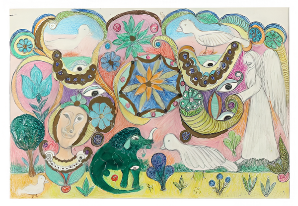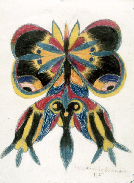 Минни Эванс с помощью насыщенных, сюрреалистических орнаментов и символов фиксировала ангелов, глаза, фантастические сады — всё это приходило внезапно, требуя выхода. Творческий процесс у неё превращался в ритуал, в котором невозможно было отделить психологическое от духовного. Для неё каждый цвет, каждая повторяющаяся форма — это инструмент структурирования опыта, способ выживания через искусство.