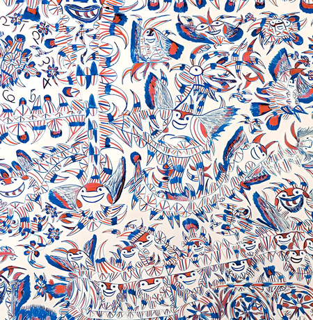 Процесс важнее результата: цвета и знаки проходят через деформацию, повторение, а каждая линия становится актом упорядочения хаоса, фиксирования духовного опыта. Искусство здесь работает как инструмент выживания и самоорганизации — визуальный ритуал, где художник одновременно воспринимает и создаёт реальность, собирает себя и мир вокруг.