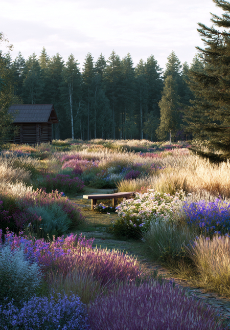 Рамка и структура — стелющийся можжевельник. Его геометрия мягко обрамляет луг, подобно низкому басу, не нарушая природной свободы мелодии.