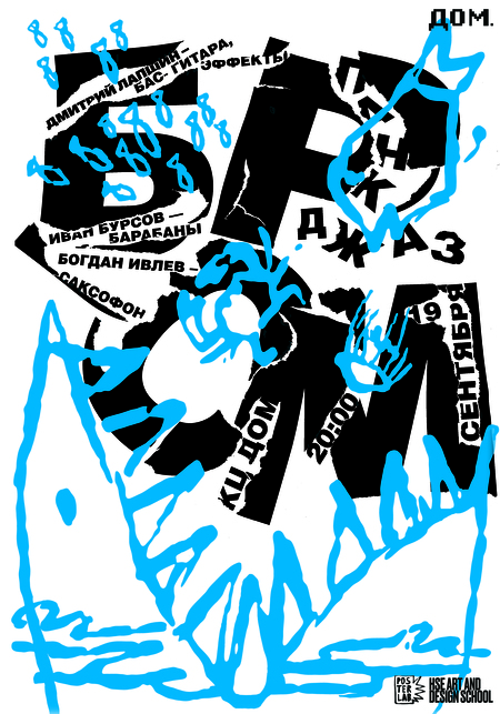 Плакат сделан в два этапа: ручное видоизменение текста, добавление цвета в поддержку образа. Расположение текста создает визуальный ритм. Эффект разъедания в нём дополняется буквальным образом зубастого существа. Плакат отсылает к силе непосредственного воздействия музыки на слушателя.