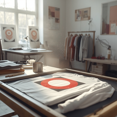- Leonardo AI Промт: Hyper-realistic photo of a high-end print workshop producing merchandise for an Ilya Chashnik exhibition. The scene shows a clean, organized, and creative studio space. Focus on a workbench: In the foreground, a pristine white crewneck sweatshirt lies flat, with a silkscreen frame holding a stencil of a iconic Chashnik red circle and black square design poised above it. Materials and Tools: A pot of vibrant red ink, squeegees, racks with other blank garments. A few finished, perfect products are neatly folded nearby. Ambiance and Lighting: Soft, natural morning light streams through a large window, illuminating dust particles in the air. The lighting is bright and clean, highlighting the textures of the fabric and ink. Style: Photorealistic