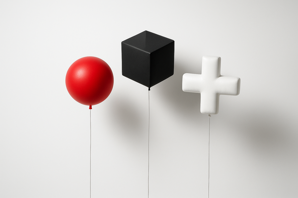 Промт 2 (воздушные шары): A stylish, conceptual photo of three helium balloons floating at different heights against a clean white background. The balloons are not standard shapes: one is a perfect red sphere, one is a black cube, and one is a white cross. This is a direct 3D interpretation of Ilya Chashnik’s geometric forms. The balloons cast soft shadows.