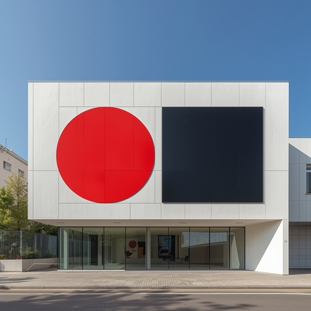 - Leonardo AI Промт: Photorealistic exterior of a modernist building housing a creative print studio. The facade is clean and geometric, made of white concrete and large glass panels. A massive, iconic red circle and a black square, inspired by Ilya Chashnik’s art, are integrated into the facade as architectural elements. Sharp daylight, clear blue sky, professional architectural photography.