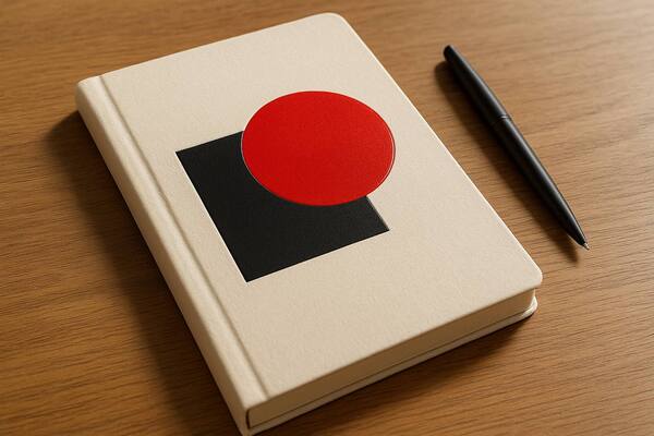 Промт 4 (блокнот): Product photography of a premium hardcover notebook. The cover is made of thick, textured cream-colored paper. The design is embossed with a minimalist geometric composition: a debossed black square in the corner and a glossy, vibrant red circle intersecting it. No text, pure visual design. The notebook is shown on a simple wooden desk next to a black pen. Soft, natural side lighting that highlights the embossing and texture. Hyper-realistic, detailed shot.