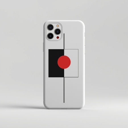 Промт 2 (чехлы): Product photography of a sleek white smartphone case. The case has a matte finish. The back features a minimalist graphic design in the style of Ilya Chashnik’s Suprematism: an asymmetric arrangement of a large black square and a floating red circle. The case is shown isolated on a clean, neutral background, professional studio lighting highlighting its texture. 3D render, hyper-realistic.