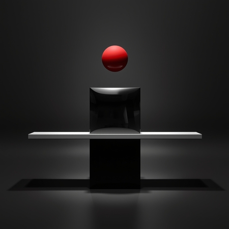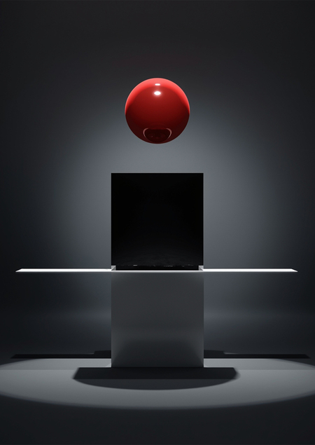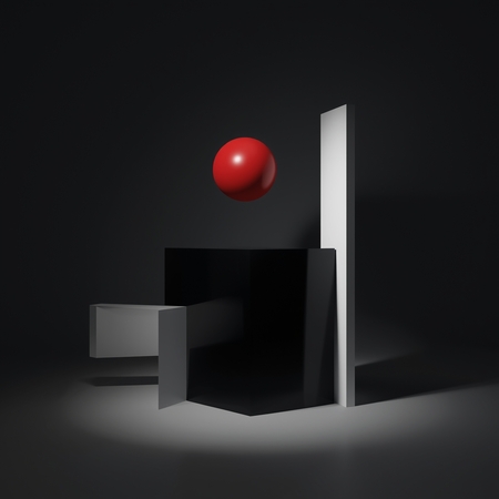 предметы выставки -Leonardo AI A minimalist 3D composition for a book cover, inspired by Ilya Chashnik’s Suprematism. Volumetric geometric shapes: a floating red sphere, a glossy black cube, and a thin white rectangular plane, arranged in a perfectly balanced, asymmetrical layout. Dramatic studio lighting with a single spot light creating sharp, long shadows and deep contrasts. The background is a deep, matte charcoal gray. Rendered in ultra-high detail, Octane render, cinematic atmosphere. No text.