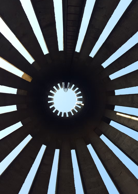 При этом сами белые бетонные пилоны своей геометричностью, соединенной с плавностью линий, создают ощущение целостности формы, не давая зрителю причин искать в них практическую цель.