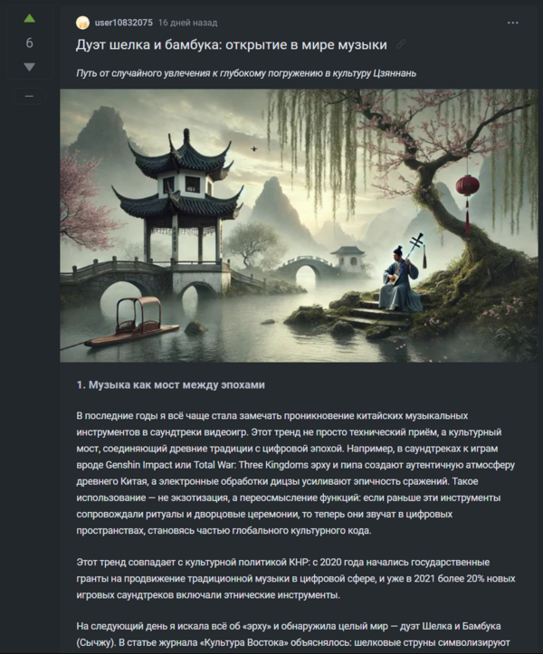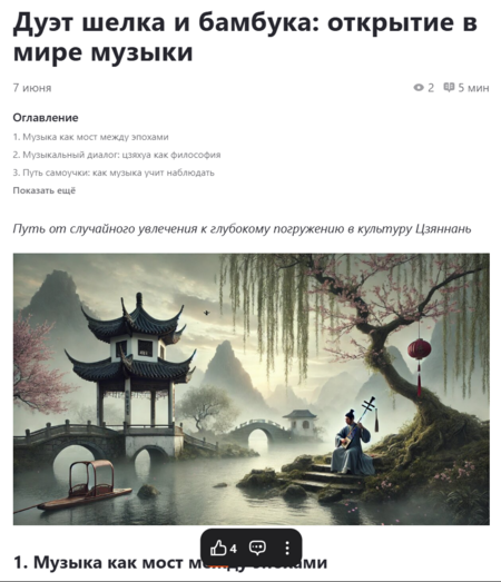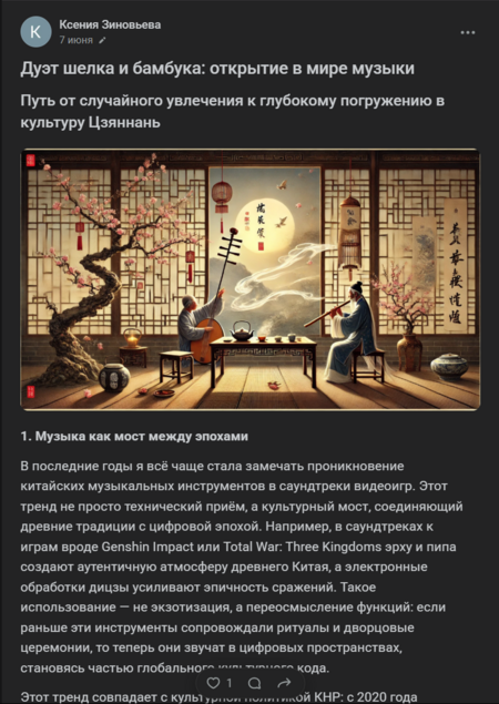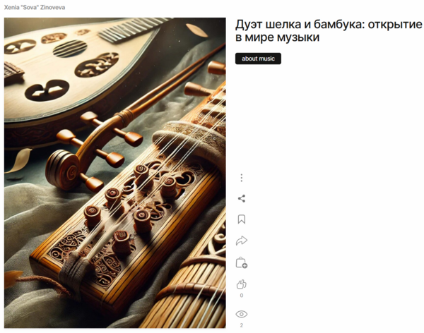 Для этой домашней работы я решила создать статью на основе созданного ранее Визуального Исследования «Китайские народные инструменты: дуэт Шелка и Бамбука».
