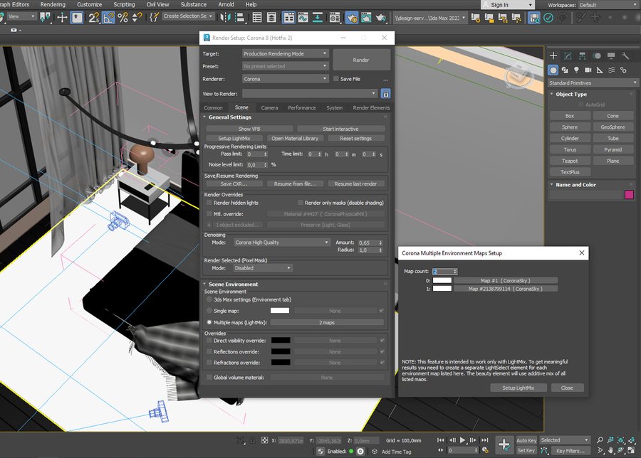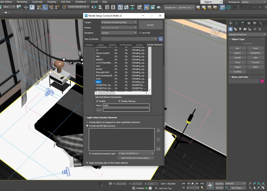 Прежде всего создаем сам LightMix, создается он двумя способами: ручной настройкой через рендер элементы и LightSelect или автоматически во вкладке F10->Scene->SetupLightMix. Я же предпочитаю ручную настройку, она дает пользователю больше контроля. Также мы можем сразу настроить различные сценарии. В данном проекте ночной и дневной сценарии были созданы с помощью Corona Sun и Sky, но с сильно отличающимися настройками. Для удобства я использовала Сorona multiple environment maps setup (находится на втором слайде в карусели), здесь можно добавлять неограниченное количество сценариев, можно использовать как источники света короны, так и HDRI.