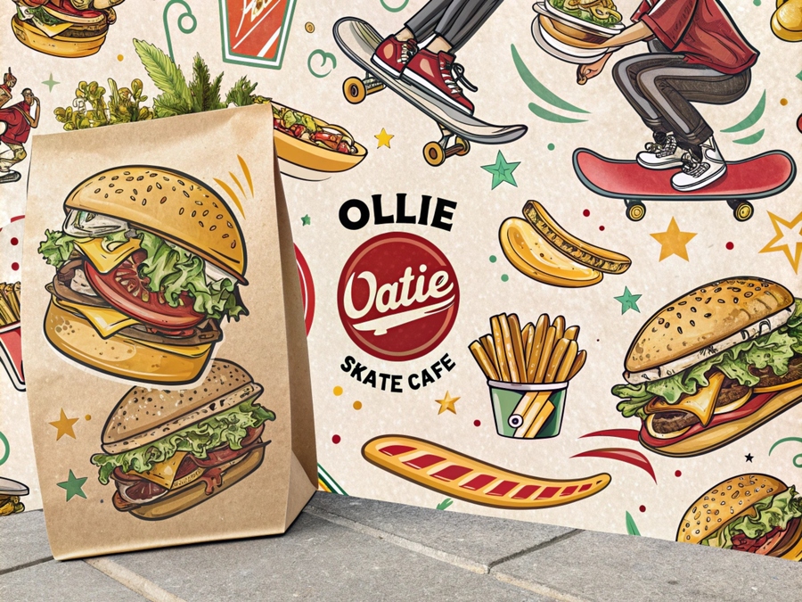Для создания проекта были использованы следующие нейросети: Leonardo.Ai, Recraft В качестве промтов были использованы простые описание как: create an identity for the Ollie skate cafe, namely a design for fast food packaging: a sandwich box, a cardboard cup for a drink, etc. The design should include a skateboard, skateboard wheels, helmet, street style, graffiti style.; The logo may include a skateboard/skateboarder/graffiti style/street style; packaging design for fast food cafe OLLIE; и т.д