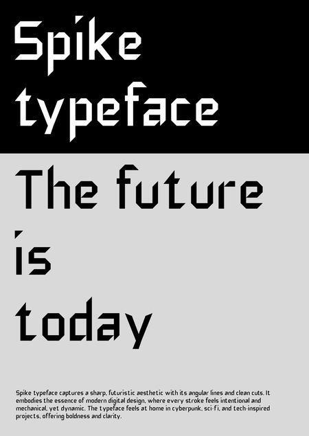 Spike — акцидентный шрифт, который передает футуристичную эстетику и атмосферу своими угловатыми линиями и четкими формами. Он воплощает цифровой дизайн, где каждый штрих выглядит намеренным и механическим, но в то же время динамичным. Шрифт идеально подходит для киберпанка, научной фантастики и проектов, вдохновленных технологиями, предлагая смелость и четкость.