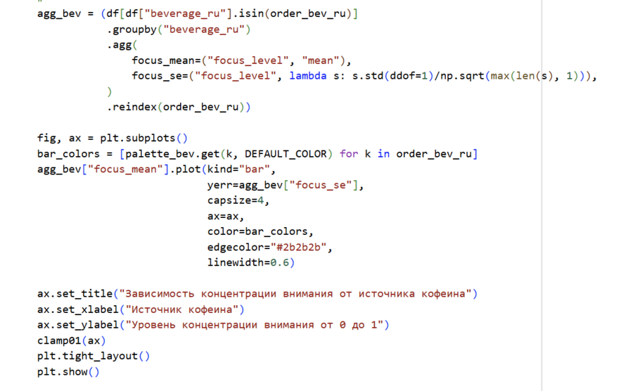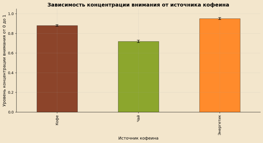 Небольшие погрешности на столбцах указывают на то, что разброс значений невелик, а различия между источниками достаточно устойчивы. В целом можно сделать вывод, что энергетики сильнее всего повышают концентрацию внимания, кофе даёт умеренный эффект, а чай является самым мягким и щадящим источником кофеина.