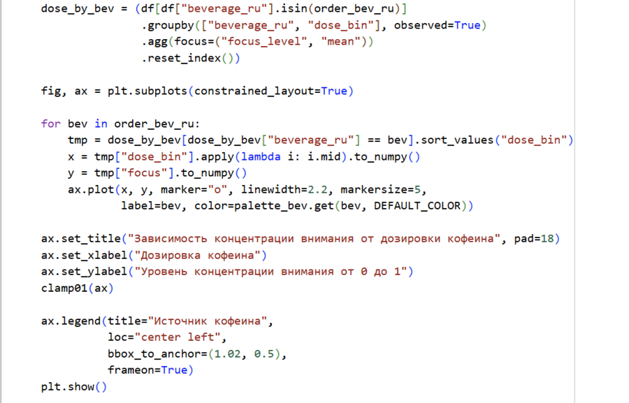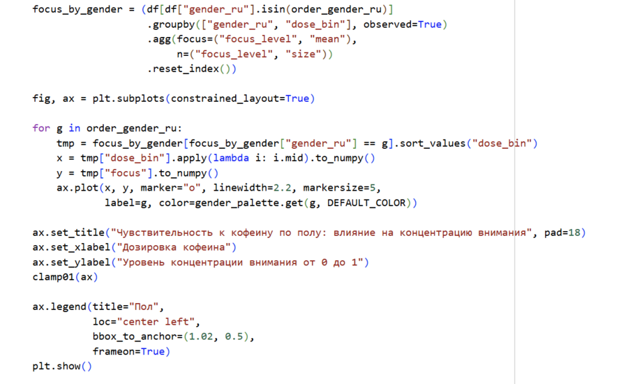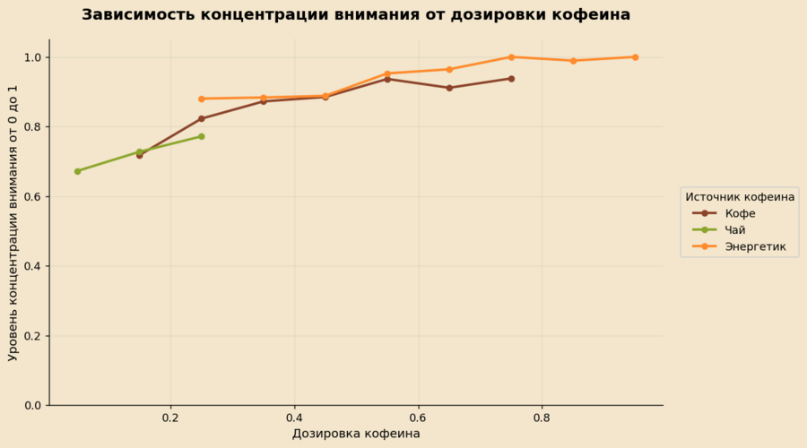 По графику видно, что между дозировкой кофеина и уровнем концентрации внимания существует выраженная положительная зависимость. При увеличении дозы кофеина показатели концентрации постепенно растут: от относительно умеренных значений при низких дозировках до высоких — при средних и более высоких.