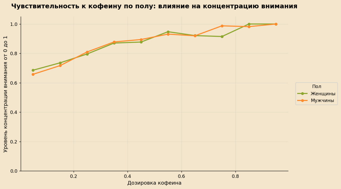 По графику видно, что и у мужчин, и у женщин с увеличением дозировки кофеина уровень концентрации внимания в целом растёт. Тренды для обеих групп очень похожи, что говорит о том, что кофеин оказывает схожее стимулирующее действие независимо от пола.