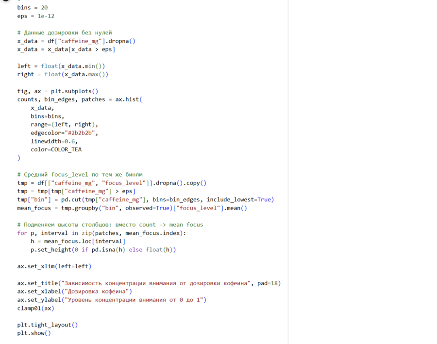 4. Разбила значения caffeine_mg на интервалы и создала колонку dose_bin через np.linspace и pd.cut.